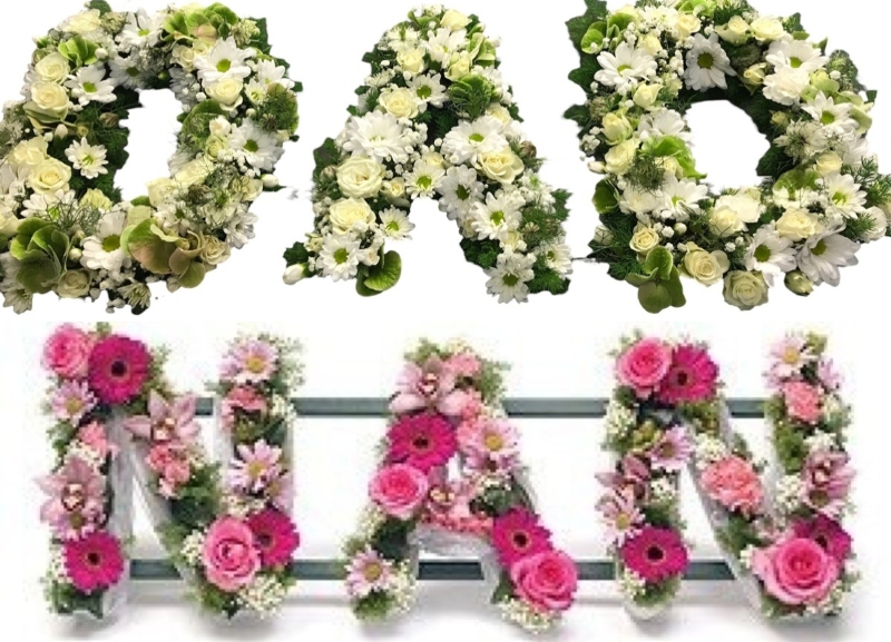 Loose Lettering tributes, Loose means that there is foliage amongst the flowers.