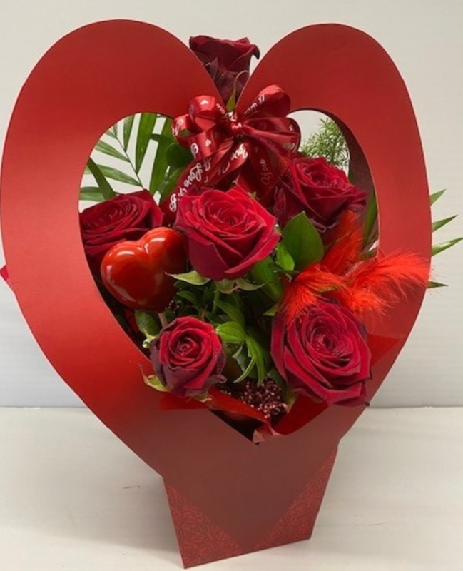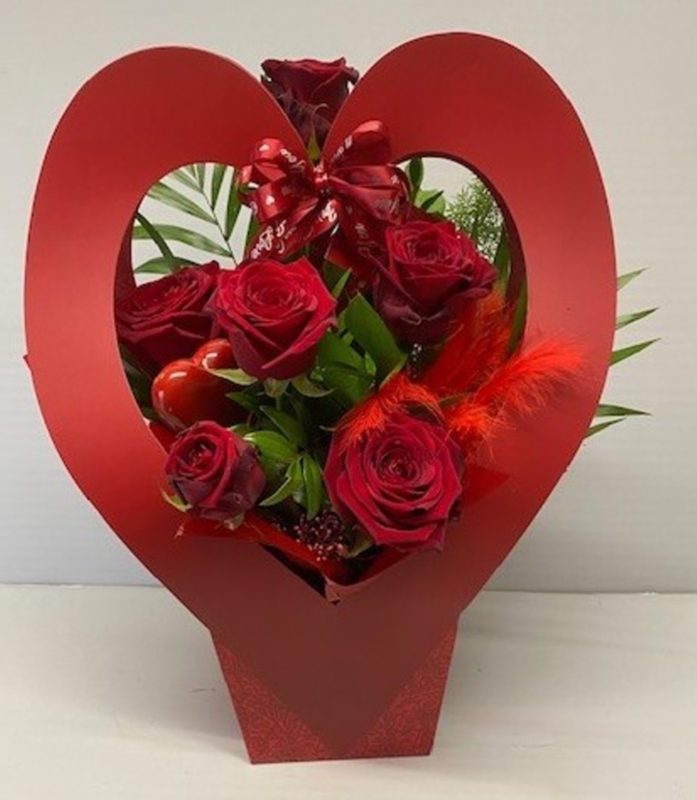 6 scented Naomi Roses arranged in foam and presented in a cardboard heart