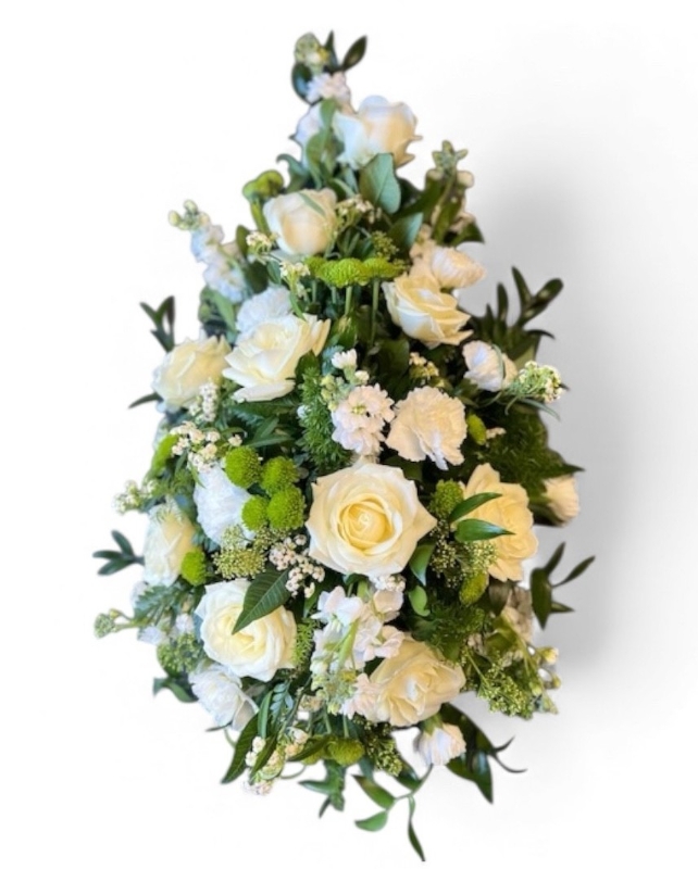 White single ended spray, includes Lillies & Roses.