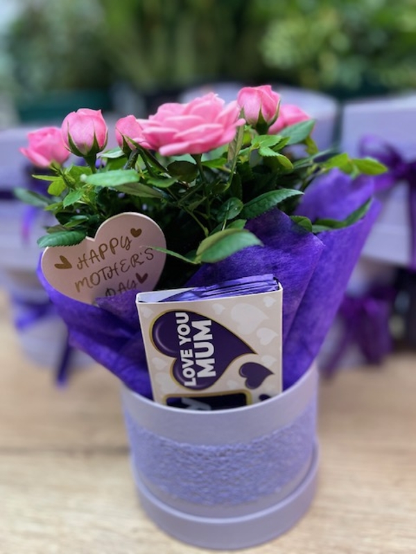 Pink Rose in planter with love you Mum Cadbury chocolate bar