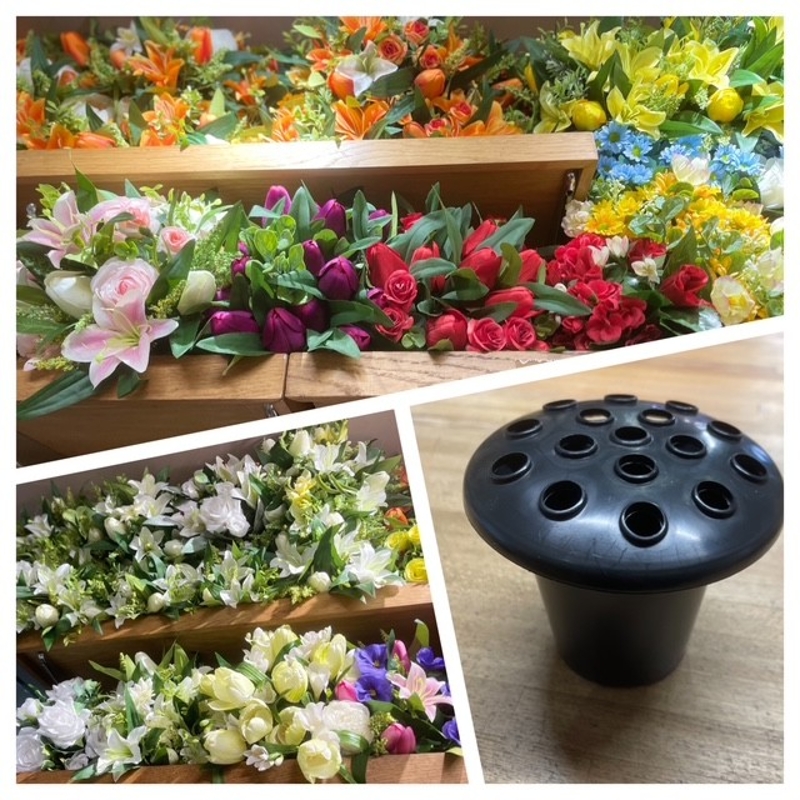 Silk grave pots ready to fit on any grave. Please call 01452 332203 for colour options and to place an order.